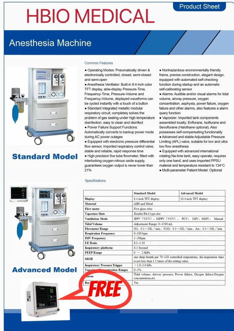 Ventilator anestesi: layar TFT berwarna 8,4 inci internal, mampu menampilkan Tekanan-Waktu, Frekuensi-Waktu, Tekanan-Volume, Frekuensi-Volume, dan dua bentuk gelombang secara bersamaan di layar. Flowmeter lima tabung presisi tinggi: O2: 0,1 ~ 10 L/menit, N2O: 0,1 ~ 10 L/menit, Udara: 0,1 ~ 10 L/menit Mode ventilasi: A/C, IPPV, SIPPV, VCV, IMV, SIMV, manual, Siaga Siaga: 70 ~ 150 kali dapat disesuaikan Monitor konsentrasi oksigen yang dihirup: 21 ~ 100% Alarm: alarm suara dan/atau visual untuk volume tidal, tekanan jalan napas, konsentrasi oksigen, asfiksia, kegagalan daya, kegagalan oksigen, dan alarm lainnya, juga dilengkapi fungsi permintaan alarm.
